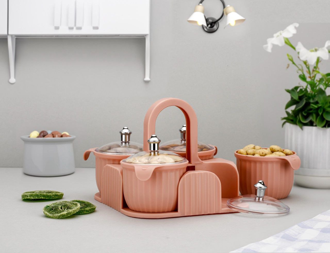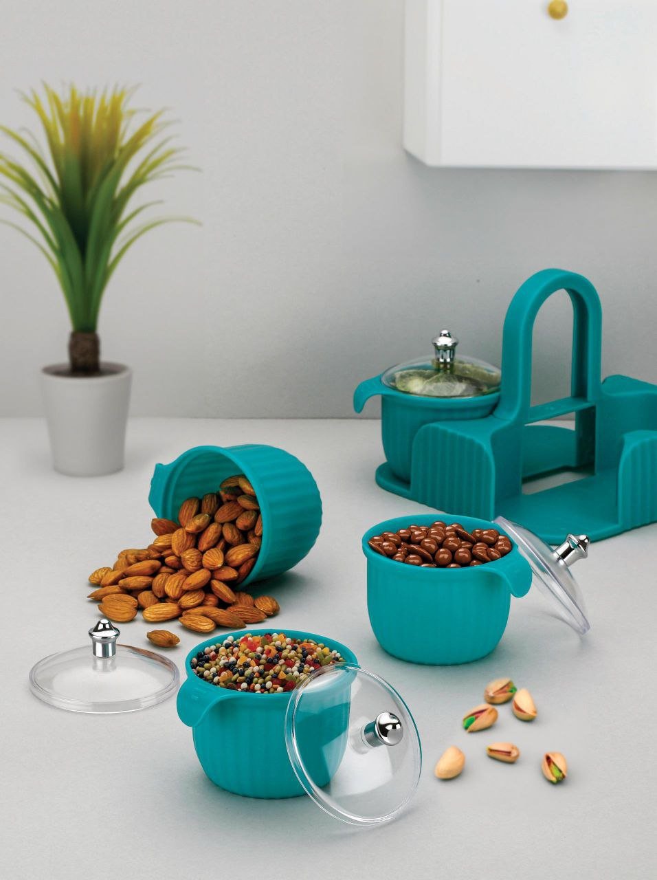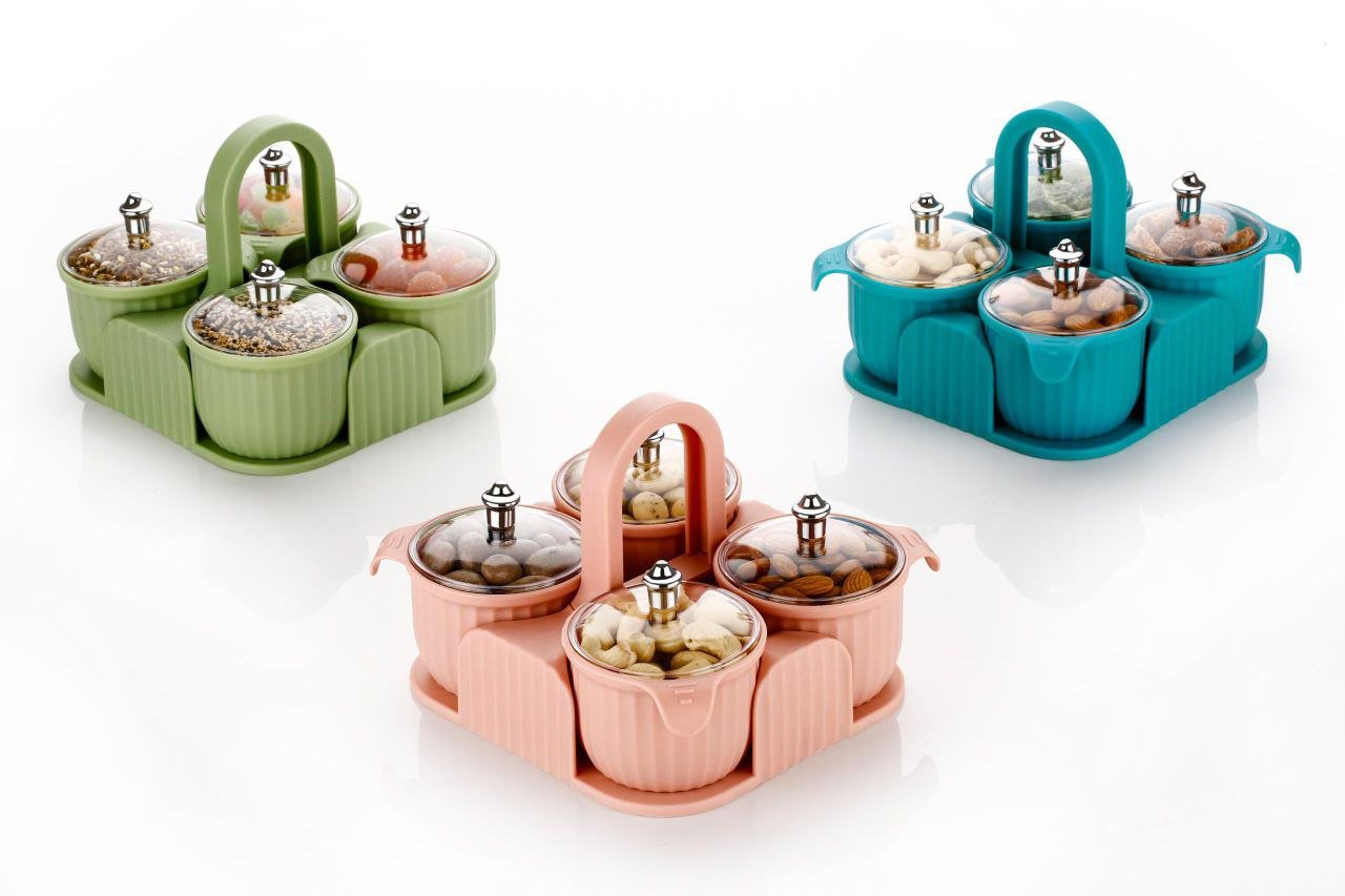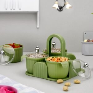 Organize and serve in style with the Marvella 4-in-1 Airtight Container Set! Featuring separate jars with lids and a sleek serving tray, it’s perfect for storing dry fruits, sweets, chocolates, candy, pickles, and mukhwas. Elegant, space-saving, and ideal for both storage and serving.